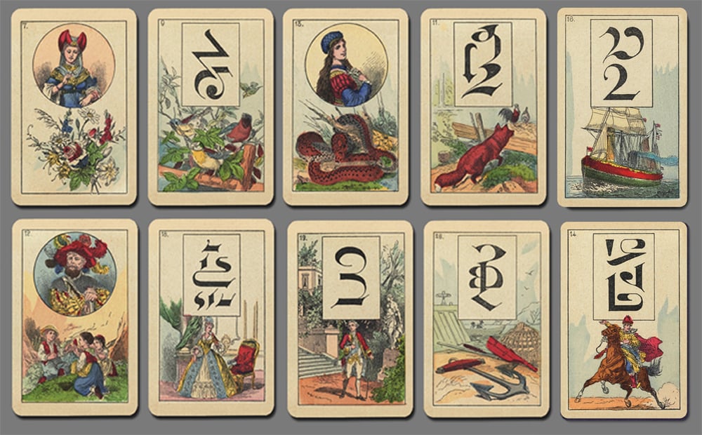 Printed in Germany by a long defunct publisher, the line drawings are splendidly detailed with dashes of color to bring them wonderfully alive. The numbering is not the usual Lenormand numbering and a few cards are non-standard, like the uncolored Sigil Lenormand I repro'd a couple of years ago. When I first saw them, the things that first captivated me were the insets. Not the typical pips. And, oh, and the male and female characters in place of the court cards, so elegantly rendered, although not identified with suits. The publisher's name is on card No. 36, "Ensslin & Laiblin, Reutlingen."