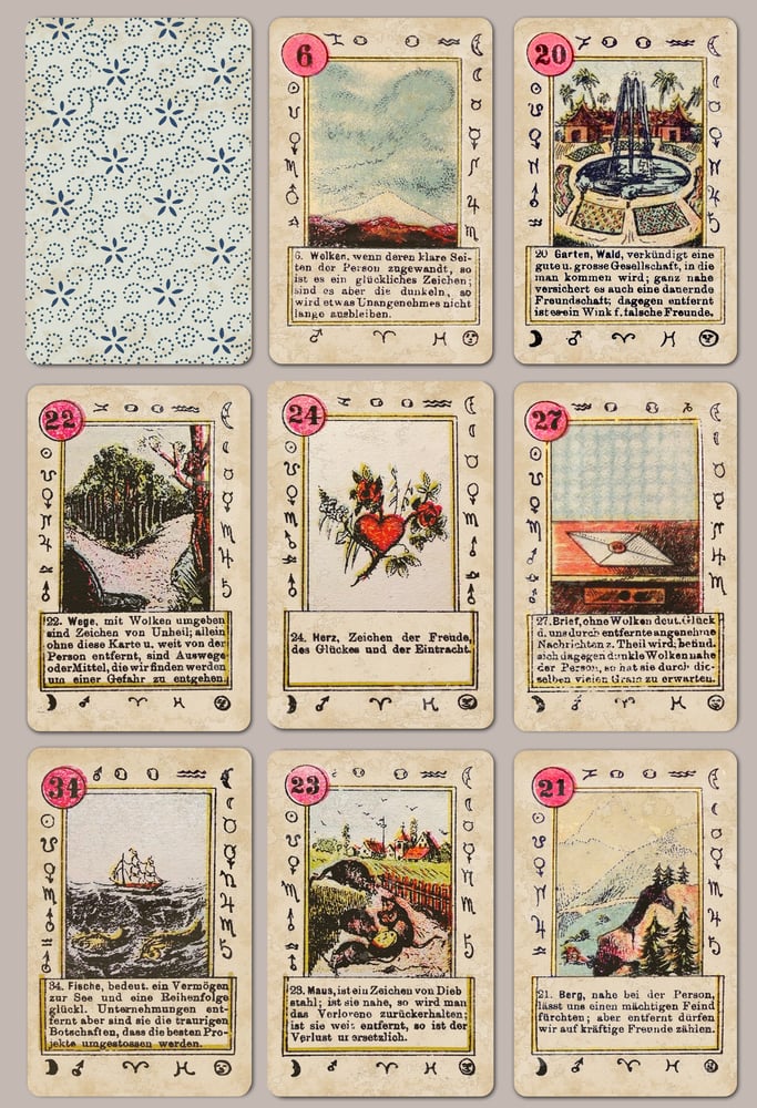 The now defunct online Lenormand Museum dated these very rare Lenormand cards at around 1890 but had no further information. Astrological symbols surround the central illustrations, with German meanings below the images.
